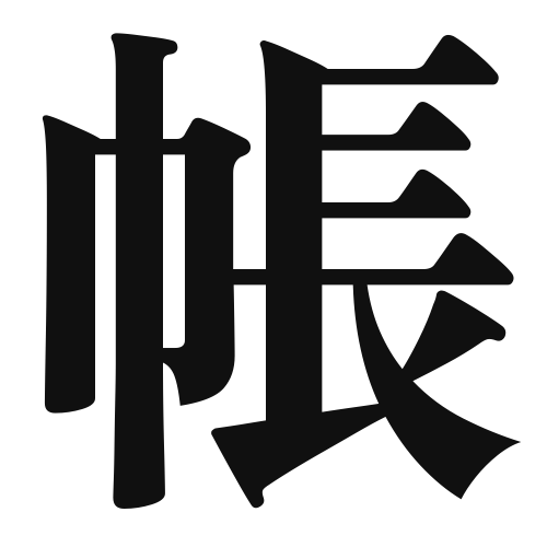 Formation of the Kanji: The kanji “帳” is a compound character (会意文字) that combines elements to convey its meaning. It consists of the radical for “cloth” (巾) at the top, which suggests something that covers or wraps, and the character “章” (shō) at the bottom, which relates to “sign” or “mark.”