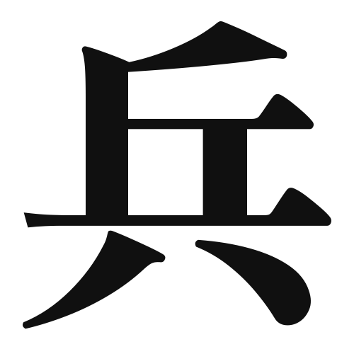Formation of the Kanji: The kanji “兵” is classified as a phonetic-ideographic character (形声文字). It combines a phonetic component with a meaning component, representing both sound and meaning.